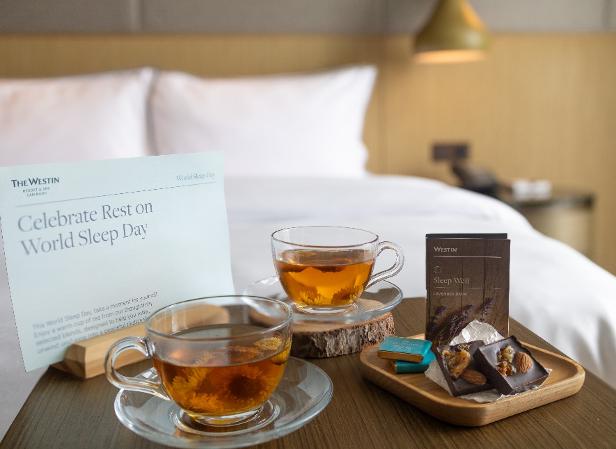 Nhân dịp Ngày quốc tế giấc ngủ 13/3, các khách lưu trú trong đêm này sẽ được tận hưởng nghi thức "turndown" đặc biệt, lấy cảm hứng từ trải nghiệm Cam Ranh Wellness. Nghi thức thư giãn buổi tối bao gồm: Trà thảo mộc hoa cúc và bạc hà; Mặt nạ che mắt hỗ trợ giấc ngủ; Tinh dầu hoa oải hương thư giãn; Tuyển tập nhạc ngủ chuyên biệt; Thực đơn Sleep Well được thiết kế giúp xoa dịu giác quan.
