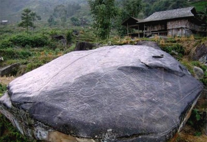 Ấn tượng nhất trong số đó là phiến đá khổng lồ hình mai rùa, dài gần 13m, trên bề mặt có hàng trăm ký hiệu khắc chạm. Nổi bật là vòng tròn đơn, vòng tròn đồng tâm tỏa tia, hồi văn vuông, dải rãnh song song, hình chữ nhật, dấu bàn chân và bốn hình người khắc thô sơ. Một số hình khắc cách điệu sinh thực khí nữ liên tưởng đến tín ngưỡng phồn thực của cư dân cổ.