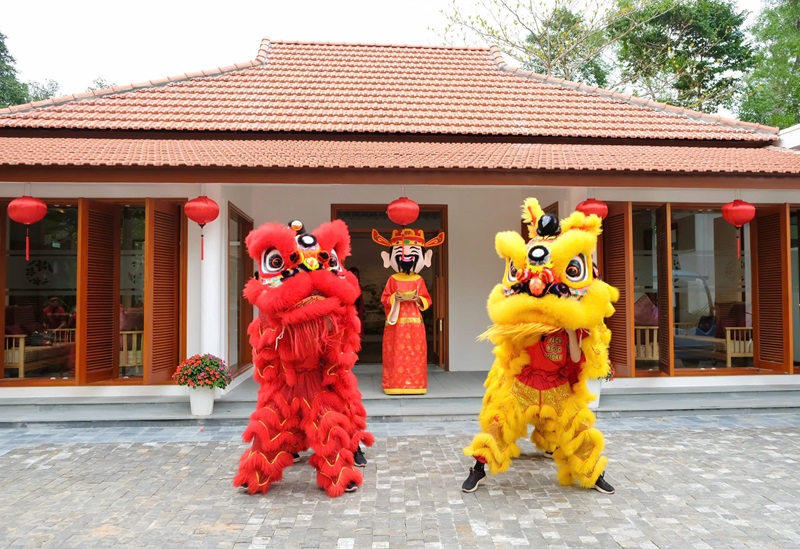 Thực đơn Tết sung túc với giá 650.000 đồng/người đầy ắp những món ngon như cuốn tôm chua Huế, bò nướng lá nguyệt quế, heo quay giòn da, và cá mú nướng sa tế. Những ngày nghỉ ở đây còn mang tới nhiều hoạt động như múa lân, trò chơi đập niêu đất hoặc ném dù tại làng nghề thủ công, mang đến niềm vui cho bạn và gia đình. Giá phòng từ 4.200.000 đồng/đêm.