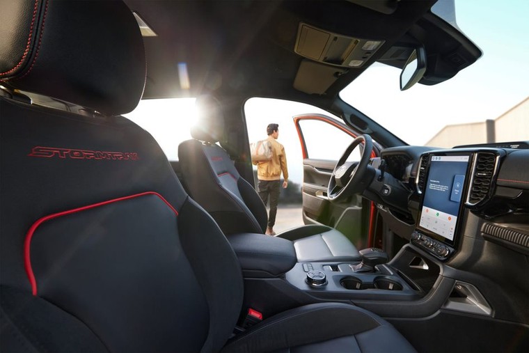 Trong khoang nội thất, Ford Ranger Stormtrak được bọc da với phối màu đen đỏ cao cấp, dòng chữ Stormtrak được thêu trên lưng ghế cùng đường chỉ may trang trí màu đỏ trên các vị trí bọc da, kết hợp cùng ốp mạ Chrome tăng sự sang trọng. Bên cạnh màn hình giải trí 12 inch quen thuộc, một số tính năng cao cấp mới được trang bị trên xe là cụm cần số điện tử, đồng hồ tốc độ kỹ thuật số 12,4 inch, ghế hành khách phía trước chỉnh điện 8 hướng.