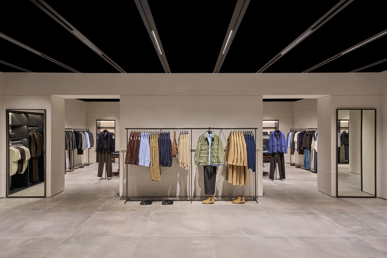Khu vực thời trang nam tiếp nối cùng nguyên lý kiến trúc, với bảng vật liệu xoay quanh các tông xám đậm và bề mặt đá cẩm thạch. Ở cả hai nơi, các khu vực bán hàng mở được đặt cạnh những phòng trưng bày, kết nối bằng hệ khung gỗ tối màu, đóng vai trò chuyển tiếp giữa các không gian.